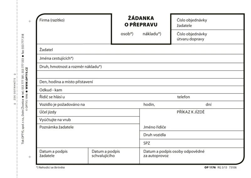 ŽÁDANKA O PŘEPRAVU OPTYS A6/100l