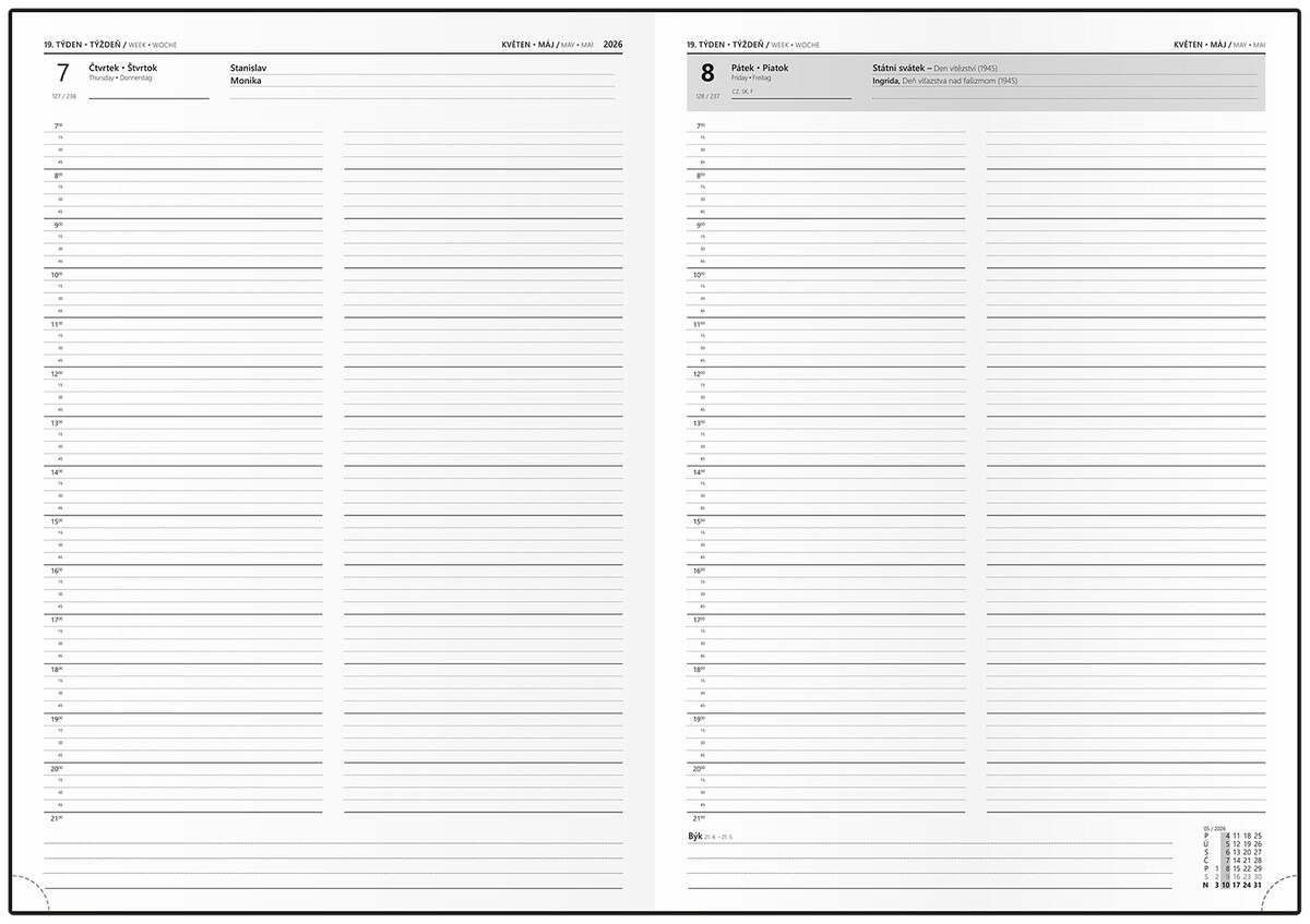 Denní diář ve formátu A4 v oblíbeném hladkém materiálu vivella. Díky velkému formátu Vám diář poskytne velký prostor pro každodenní plánování.