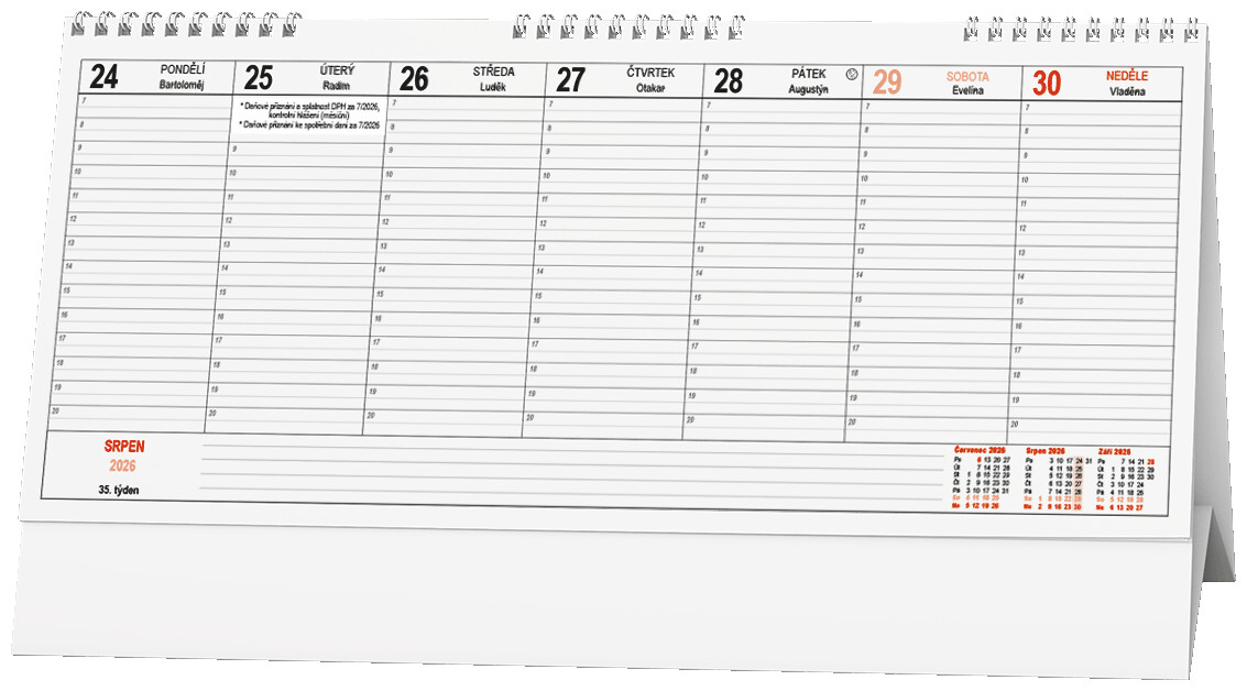 - státní svátky, ostatní svátky a významné dny, tabulkový kalendář aktuálního a nadcházejícího roku, plánovací kalendář aktuálního roku, přehled daňových povinností, místo na poznámky
