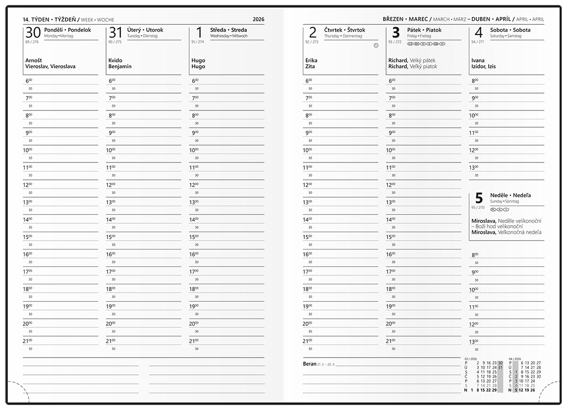 - časové rozmezí: 6:00 - 21:30, měsíční fáze, roční období, letní a zimní čas, znamení zvěrokruhu, odpočet dnů, měsíční tabulkový přehled, dny a měsíce v 4 jazycích - CS, SK, EN, DE, mezinárodní svátky: CZ, SK, A, D, PL, H, GB, E, F, I, UA, místo na poznámky