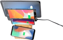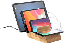 Bambusová USB nabíjecí stanice s držáky na mobil a vestavěnou bezdrátovou rychlonabíječkou. Se 2 porty USB a 1 portem USB-C pro nabíječku. Včetně AC nabíjecího kabelu.