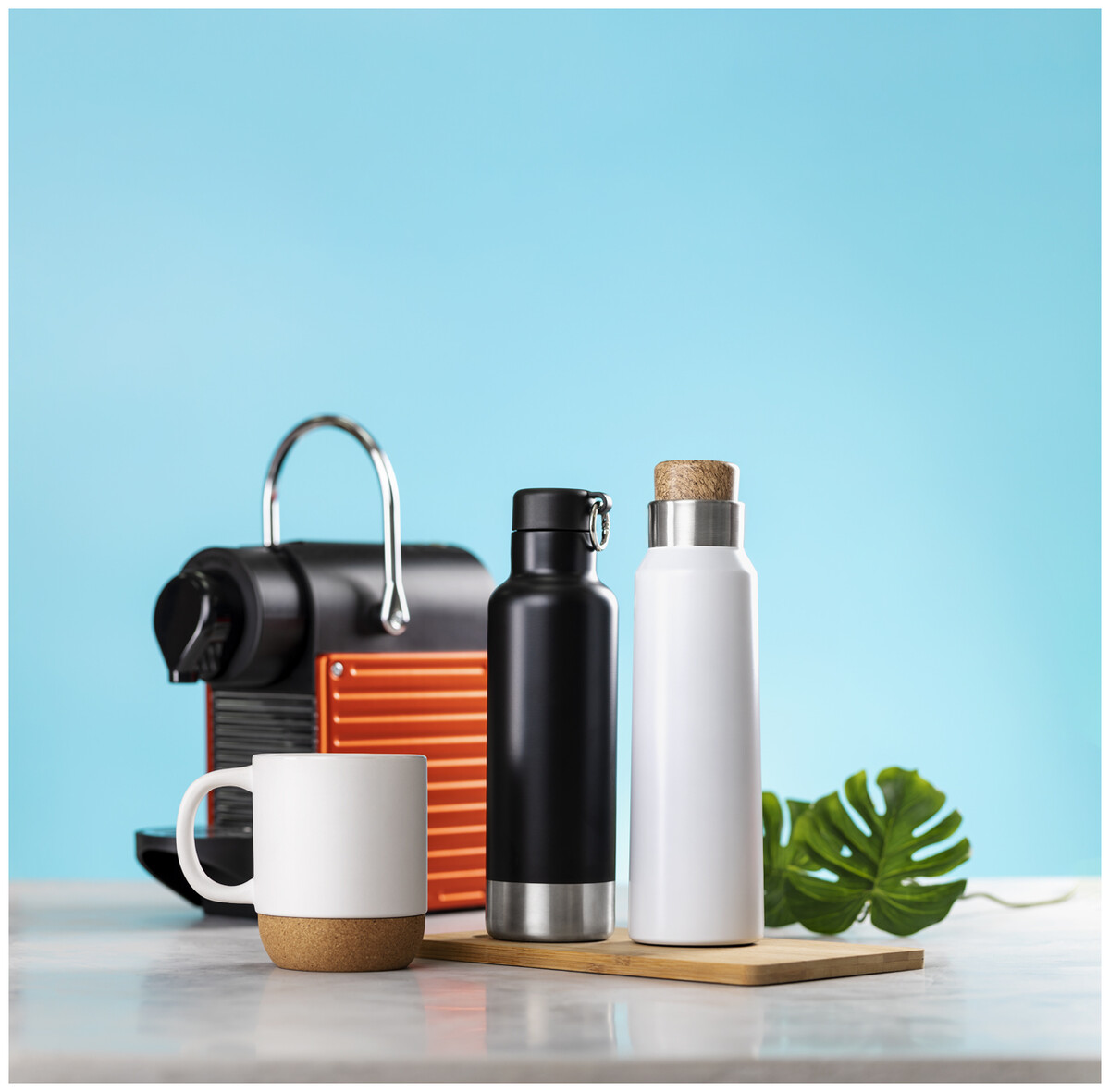 Jednostěnná sportovní láhev z nerezové oceli s korkovým vzorovaným uzávěrem, 770 ml. V kraftové papírové krabici. Nevhodné pro sycené nápoje.
