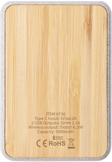 USB powerbanka s baterií 5 000 mAh z bambusu a plastu z pšeničné slámy s vestavěnou bezdrátovou nabíječkou. Se 2 USB nabíjecími porty. Powerbanku lze nabíjet přes port USB-C. Včetně USB nabíjecího kabelu.