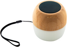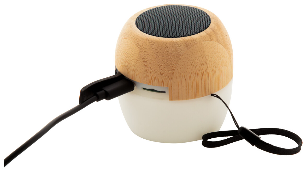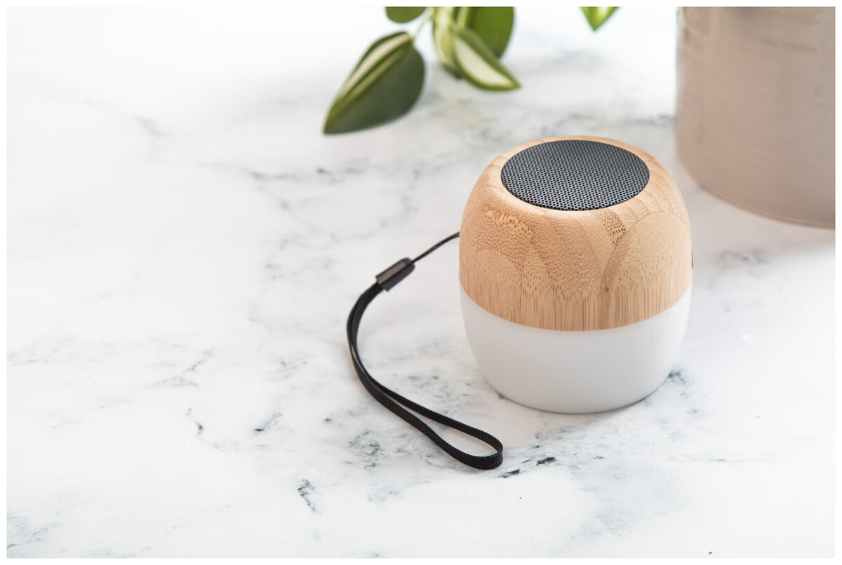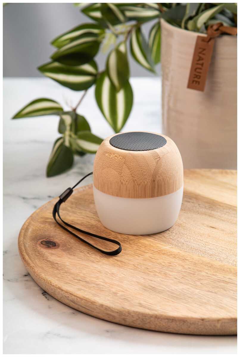 Bezdrátový reproduktor z recyklovaného ABS plastu a bambusového pouzdra s vícebarevným LED světlem ve spodní části. S popruhem na přenášení a vestavěnou dobíjecí baterií. Včetně nabíjecího kabelu USB.