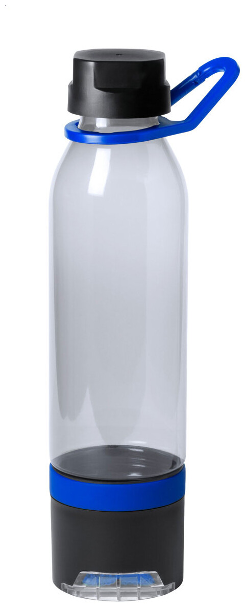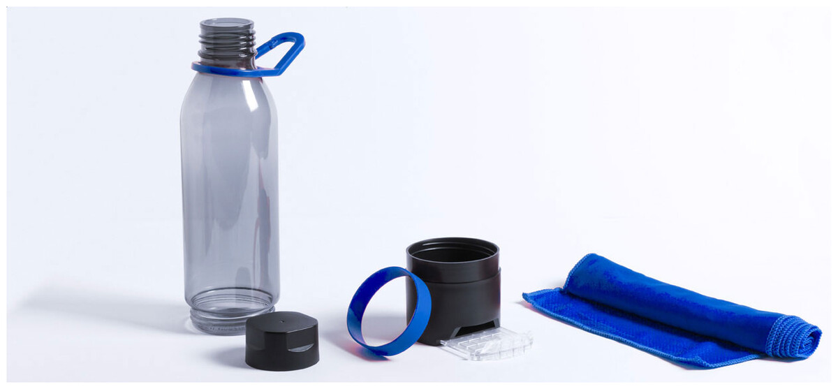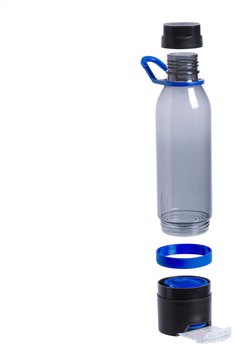 Plastová multifunkční sportovní láhev s chladicím ručníkem (390 g/m2) ve spodní přihrádce a výsuvným držákem na mobilní telefon. V dárkovém balení. Objem 650 ml. Není vhodná pro sycené nápoje.