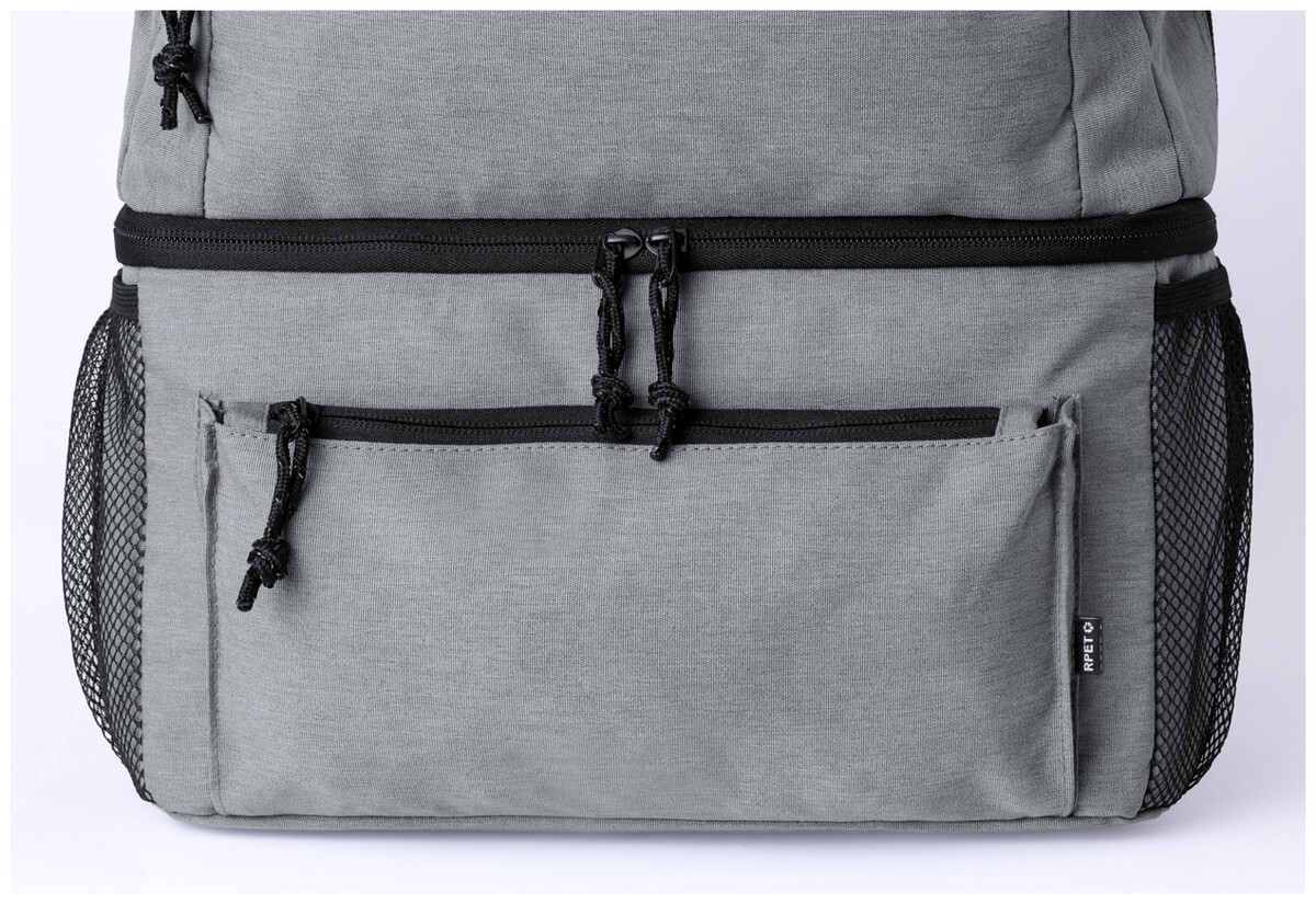 RPET batoh s PEVA polstrovanou chladicí přihrádkou, kapsami na zip, bočními síťovanými kapsami, polstrovanými zády a ramenními popruhy. Polyester 600D RPET, s výrazným štítkem RPET.