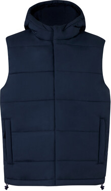 Větru a vodě odolná, vatovaná vesta s dvojitým předním zipem a knoflíkem. S kapucí a bočními kapsami. 100% polyester.