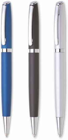 Hliníková propiska TORICO s otočným mechanismem v barvě matně modré a stříbrnými doplňky. Náplň velkoobsahová, modře píšící.