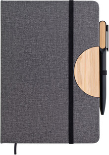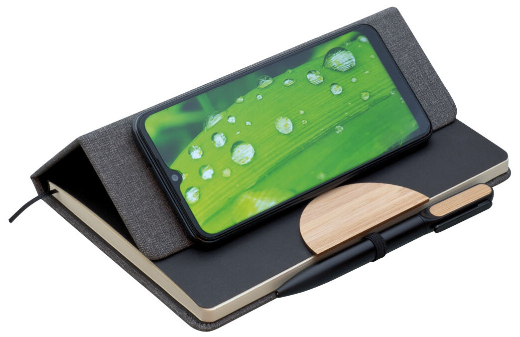 Poznámkový blok, zápisník v textilních deskách, které lze použít jako stojánek na mobil. V černé dárkové krabičce s kovovou otočnou propiskou s bambusovou vsadkou.