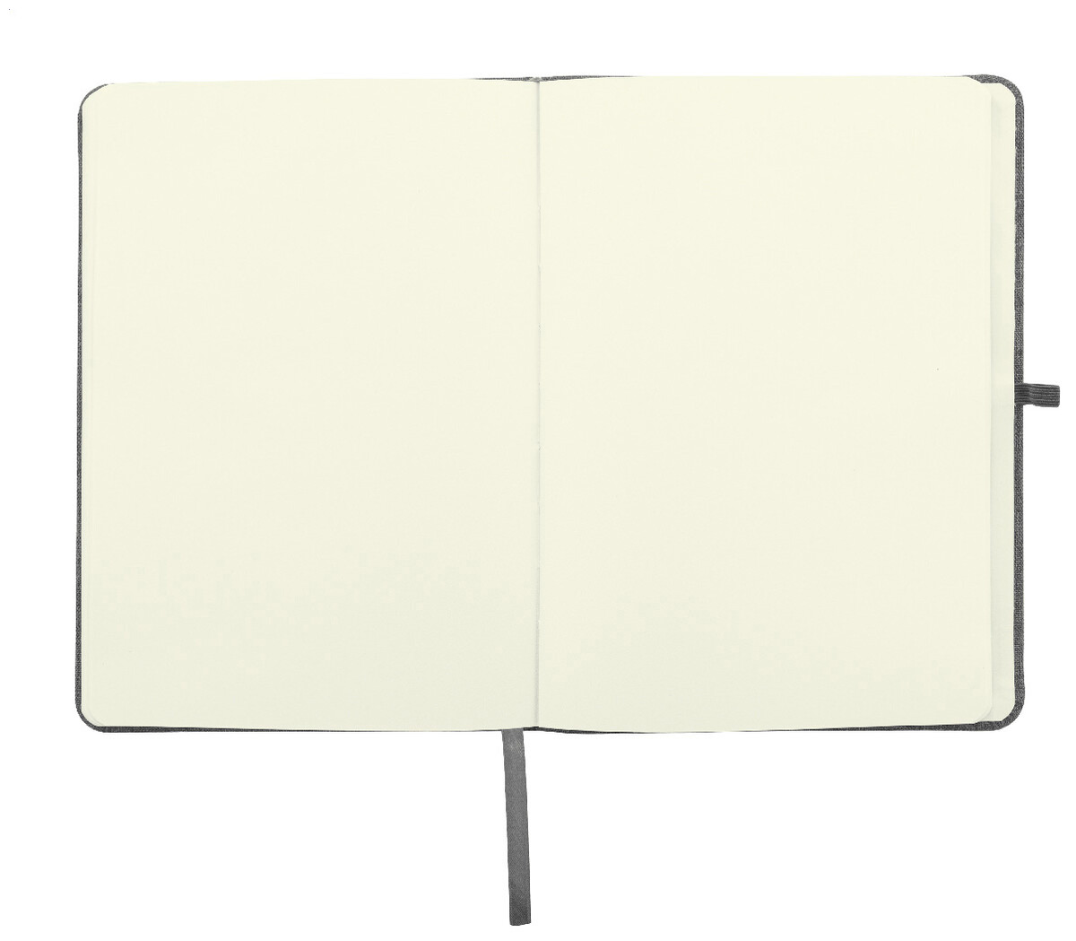 Blok A5 potažený polyesterem 300D RPET s 80 čistými listy. S gumovým páskem, záložkou a držákem na pero.