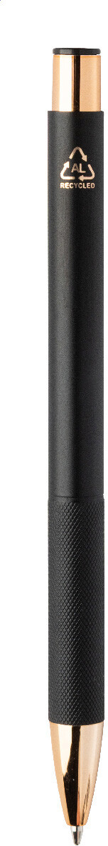 Kuličkové pero z recyklovaného hliníku s matným tělem, texturovaným úchopem a detaily růžového zlata. Se speciálním povrchem pro zrcadlové laserové gravírování v barvě růžového zlata. S modrou náplní.