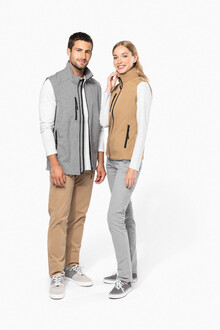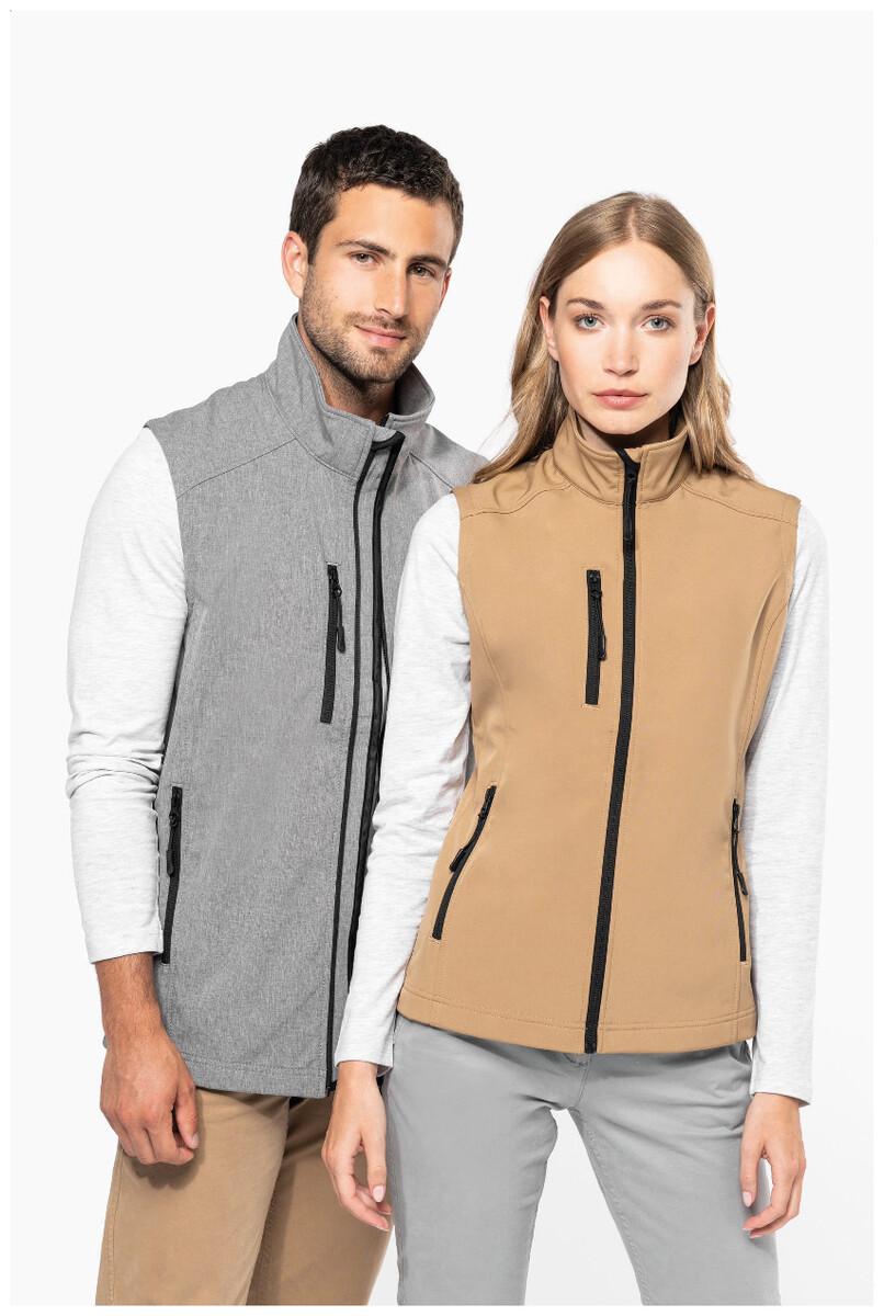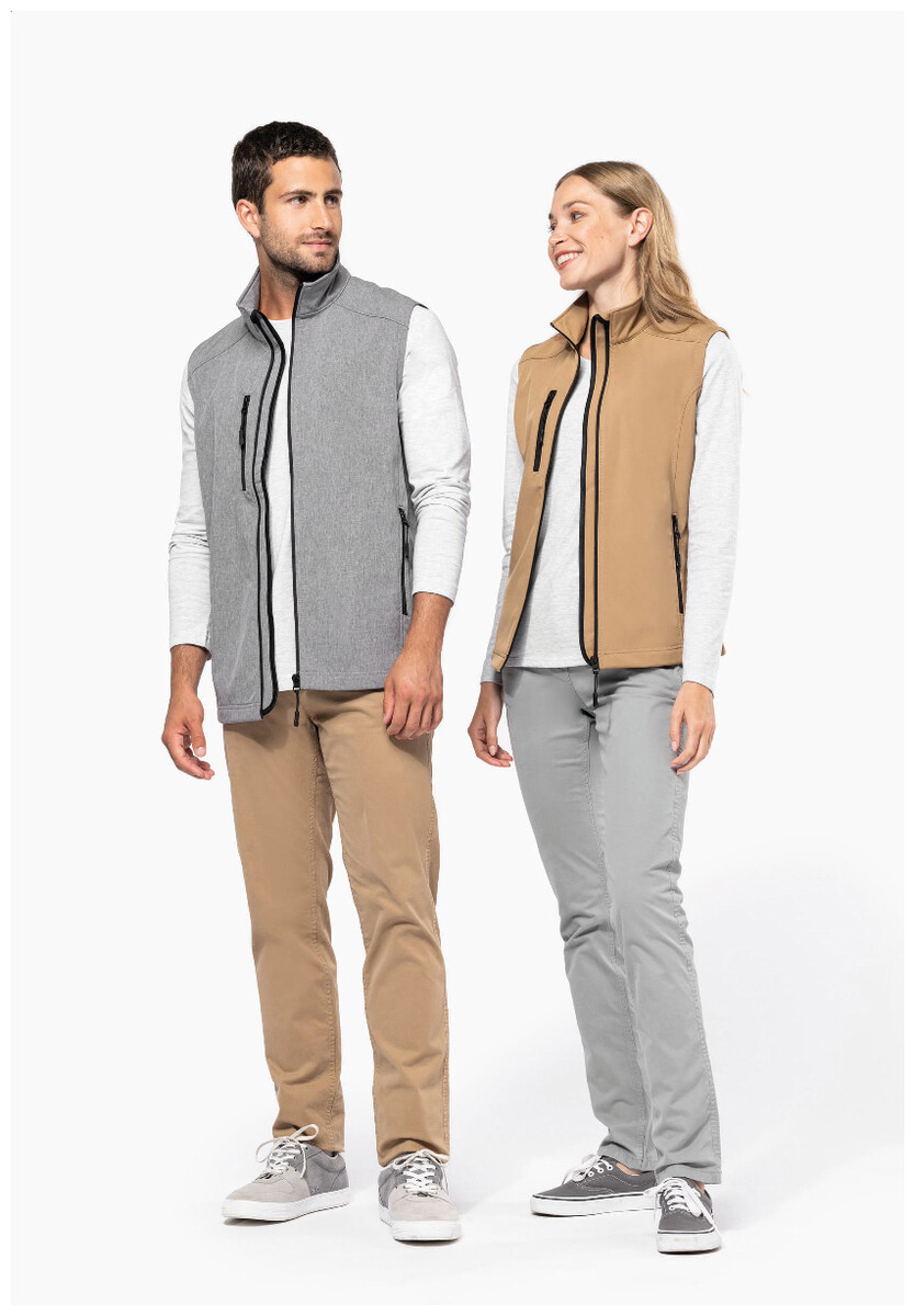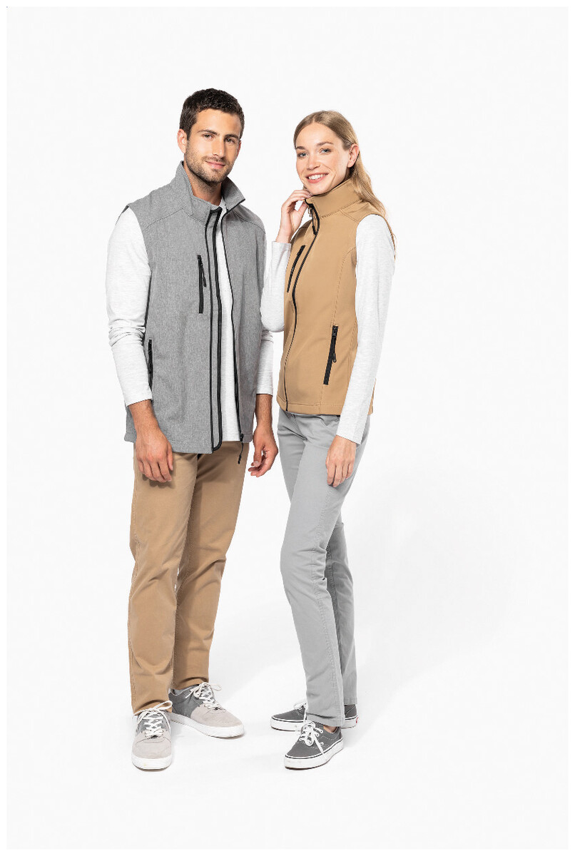 Třívrstvá, prodyšná, větru a voděodolná softshellová vesta na tělo se zipem a náprsními a bočními kapsami na zip. S prodyšnou střední vrstvou a vnitřní vrstvou z micro polar fleecu. Materiál: 95 % polyester a 5 % elastan, 300 g/m2. Výrobek značky Kariban.