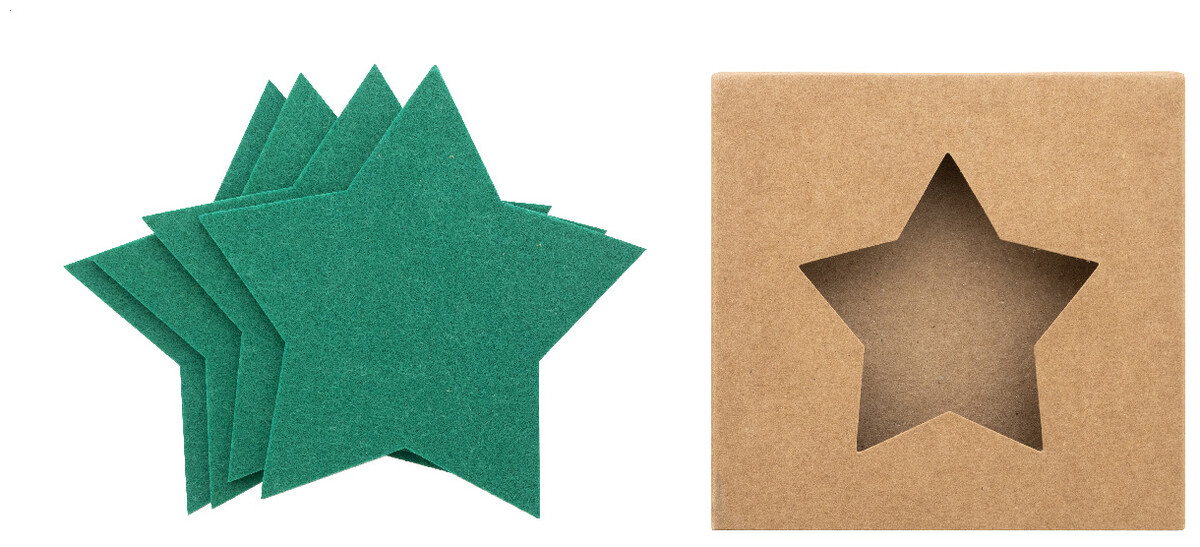 Sada 4 vánočních podtácků z plsti RPET ve tvaru hvězdy. V krabičce z kraftového papíru.