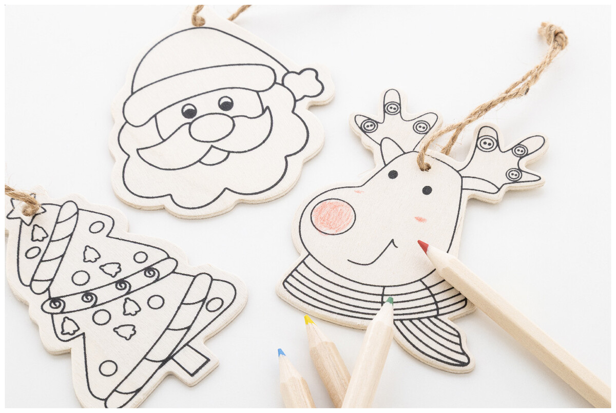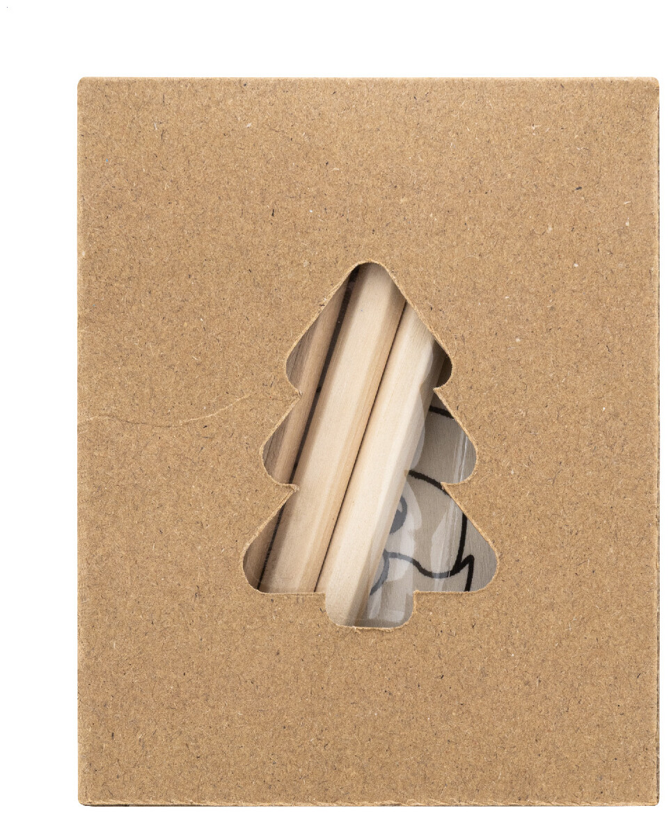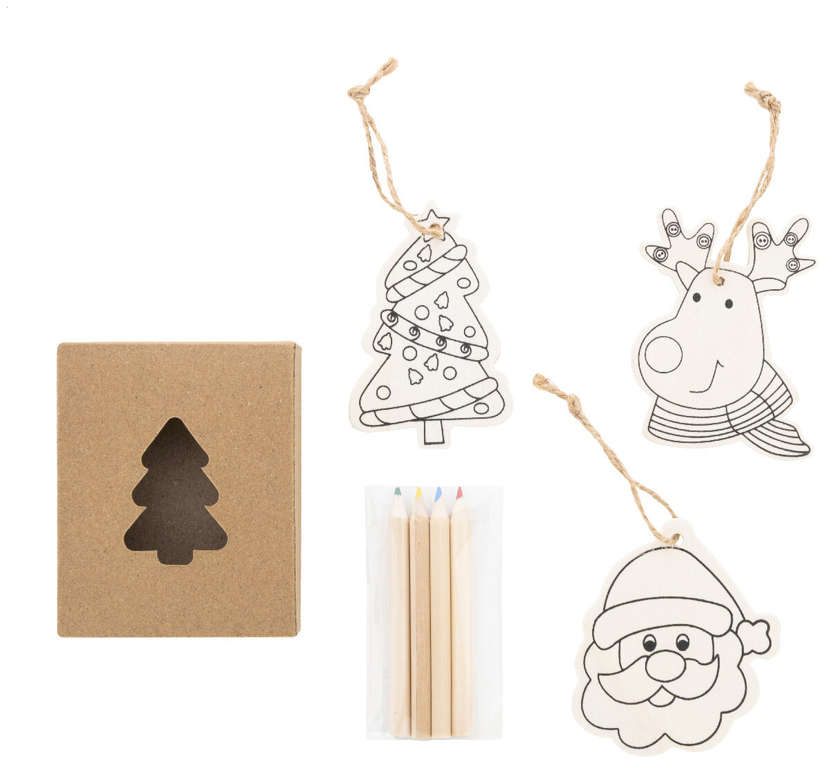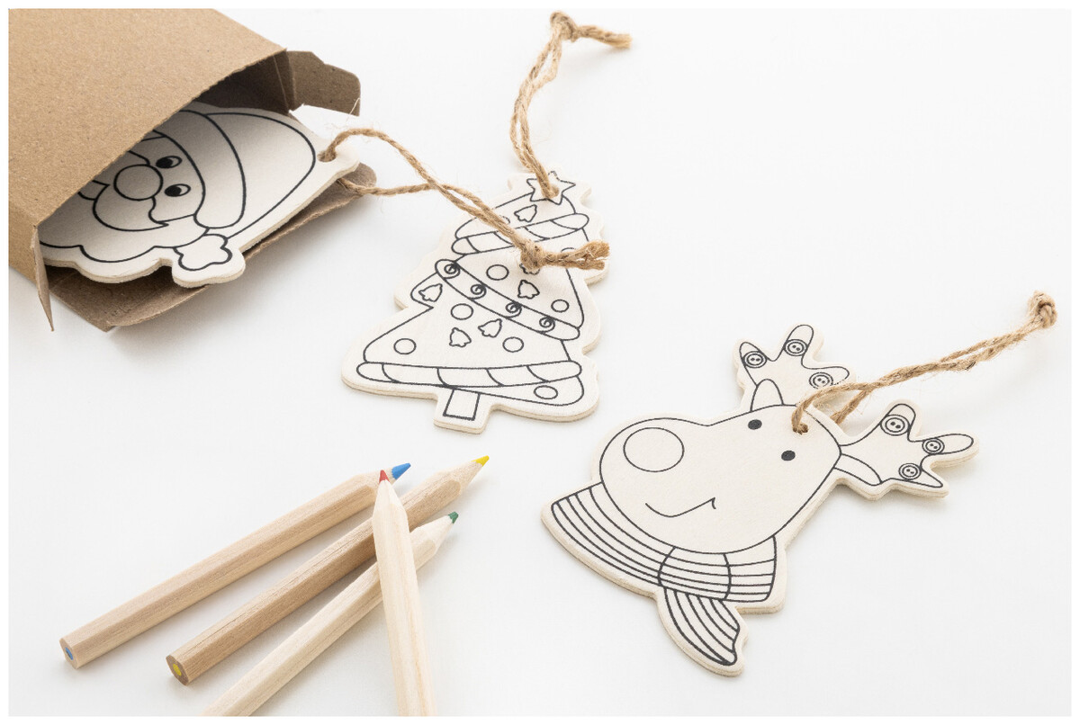 Sada vánočních ozdob na vybarvení v krabičce z kraftového papíru s vyřezávaným vánočním stromečkem. Včetně 3 dřevěných ozdob s konopnou šňůrou a 4 barevných tužek.