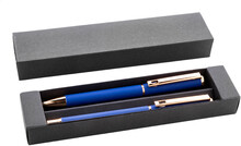 Sada per z recyklovaného hliníku s kuličkovým perem a rollerem s pogumovaným povrchem a detaily růžového zlata. S modrou náplní. Se speciálním povrchem pro zrcadlové laserové gravírování v růžovo-zlaté barvě. V černé papírové dárkové krabičce.
