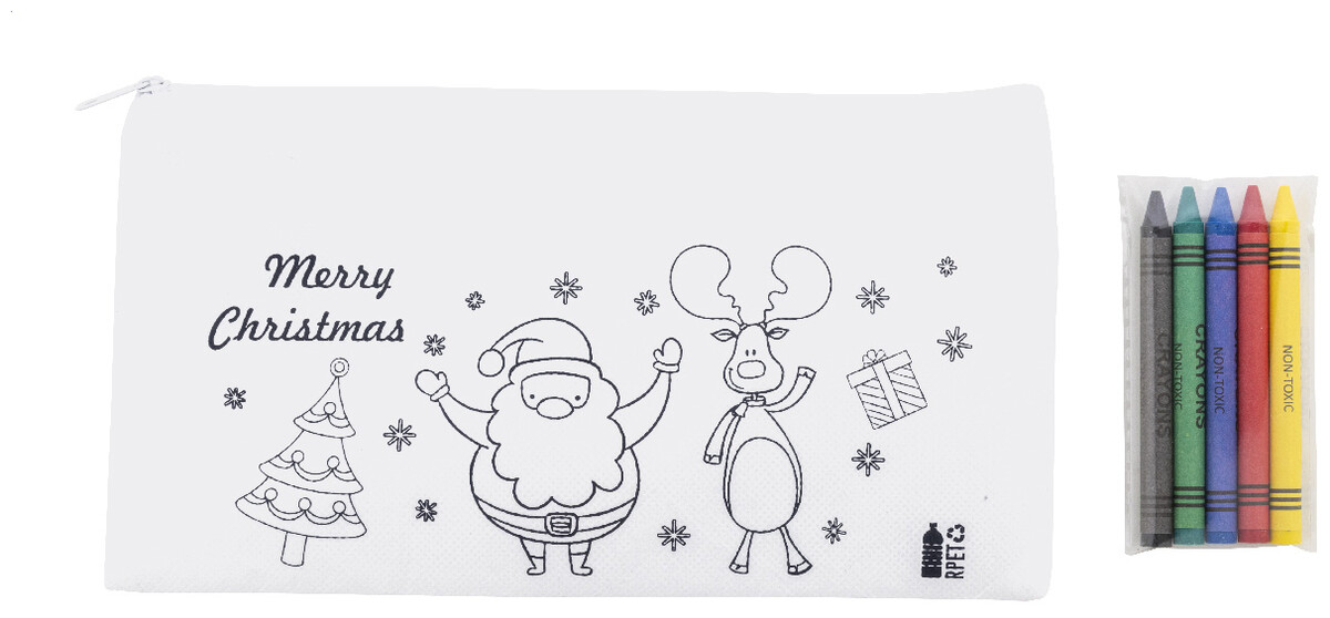 Vánoční pouzdro na pastelky na vybarvování z netkané RPET tkaniny se zapínáním na zip a 5 voskovkami.