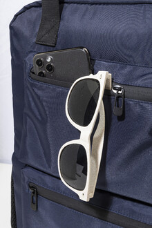 Batoh z RPET s přihrádkou na zip, 2 předními kapsami na zip, polstrovanou přihrádkou na notebook (15") a bočními síťovanými kapsami. S polstrovanými zády a ramenními popruhy, kapsou proti krádeži a popruhem na kolečkách. RPET keprový polyester s výrazným štítkem RPET.