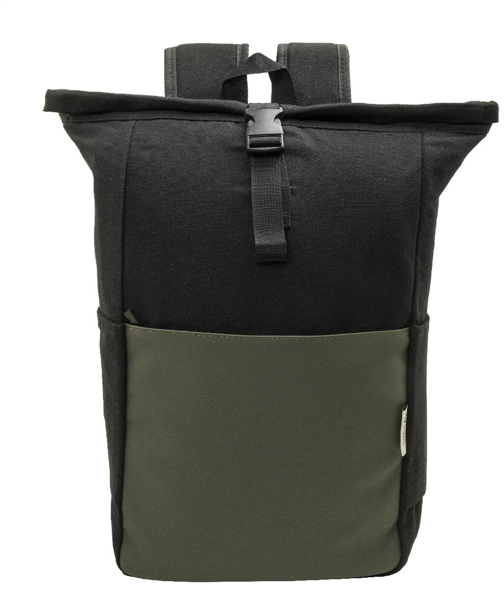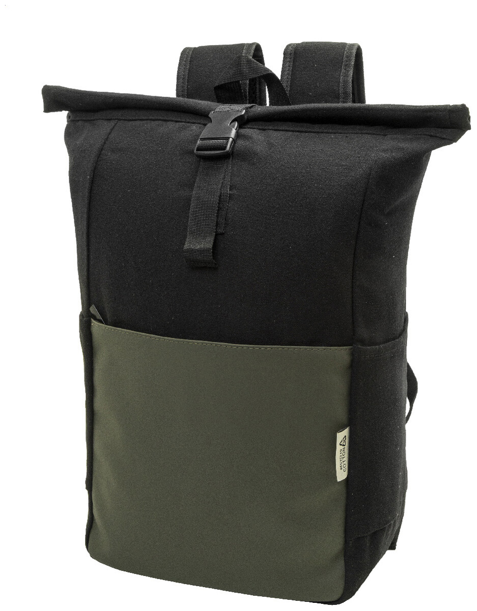 Rolovací batoh z recyklovaného plátna se zapínáním na přezku a přední kapsou na zip z měkké recyklované PU kůže. S polstrovanou přihrádkou na notebook (15"), bočními kapsami, polstrovanými zády a ramenními popruhy. 70% recyklované bavlny a 30% RPET polyesteru. S výrazným štítkem z recyklované bavlny.