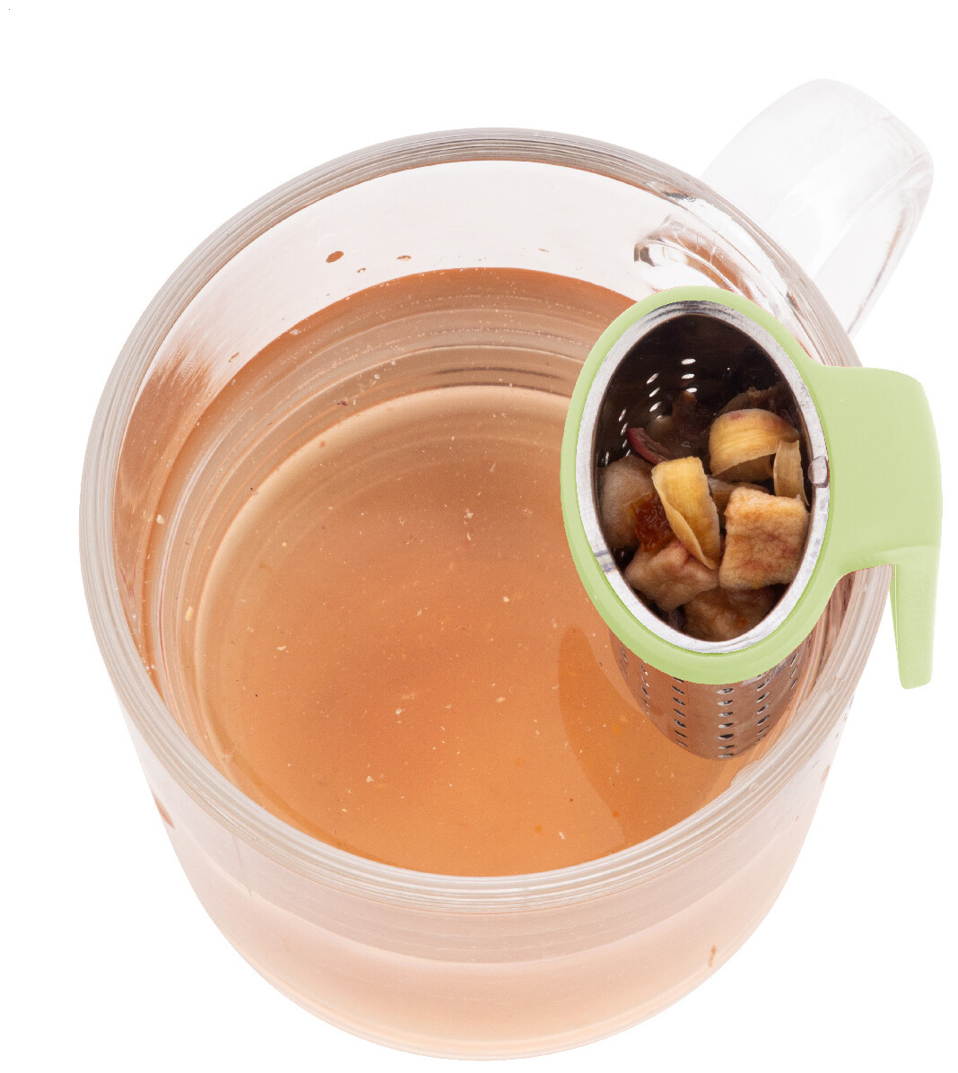 Nerezové sítko na čaj s praktickým klipem z recyklovaného ABS plastu. Navržen pro snadné připevnění k okraji hrnku.