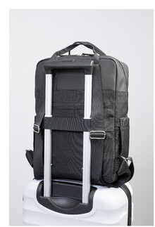 Batoh z RPET s měkkým vrškem z PU kůže, přihrádkou na zip, přední kapsou na zip, bočními kapsami a kapsou proti krádeži. S popruhem na kolečkách, polstrovanými zády a přihrádkou na notebook (15"). 900D RPET polyester s výraznou nálepkou RPET. V netkaném protiprachovém pytlíku z RPET.