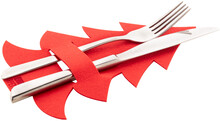 Sada 4 ks RPET plstěných držáků na příbory ve tvaru vánočního stromku. V kraftové papírové krabici.
