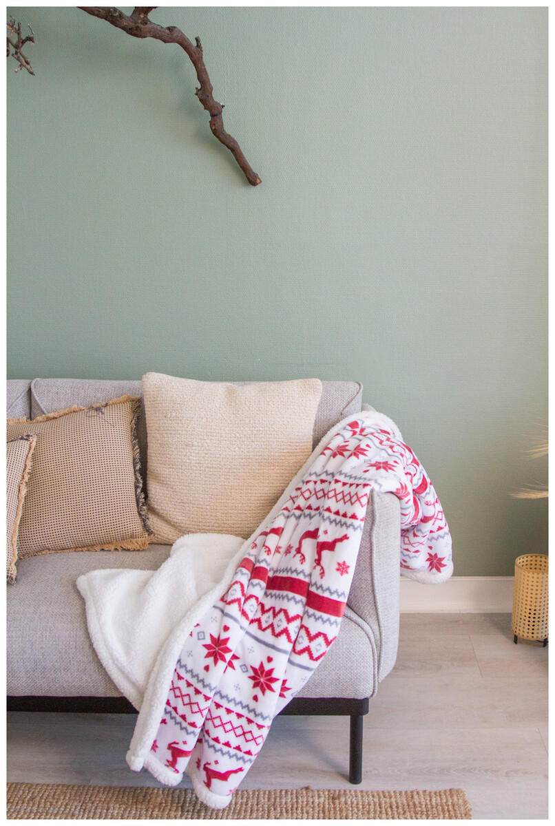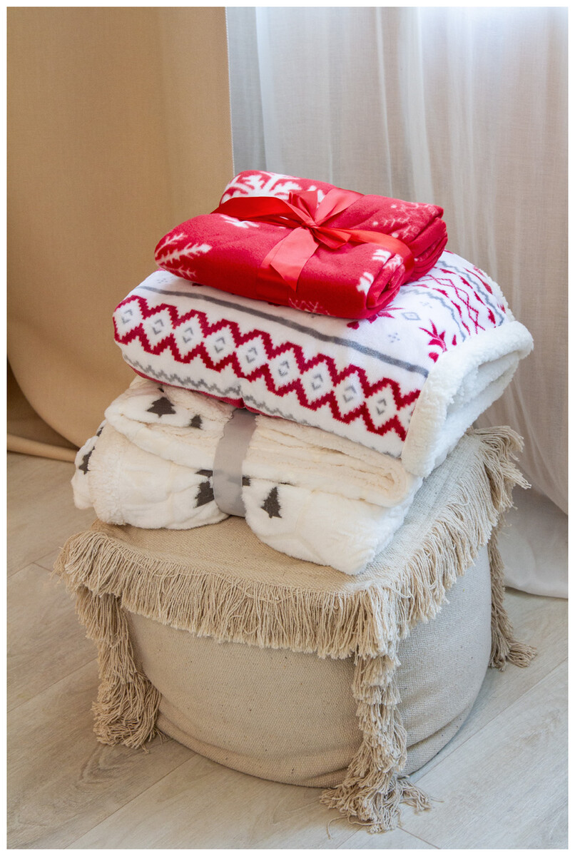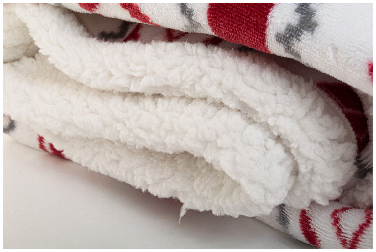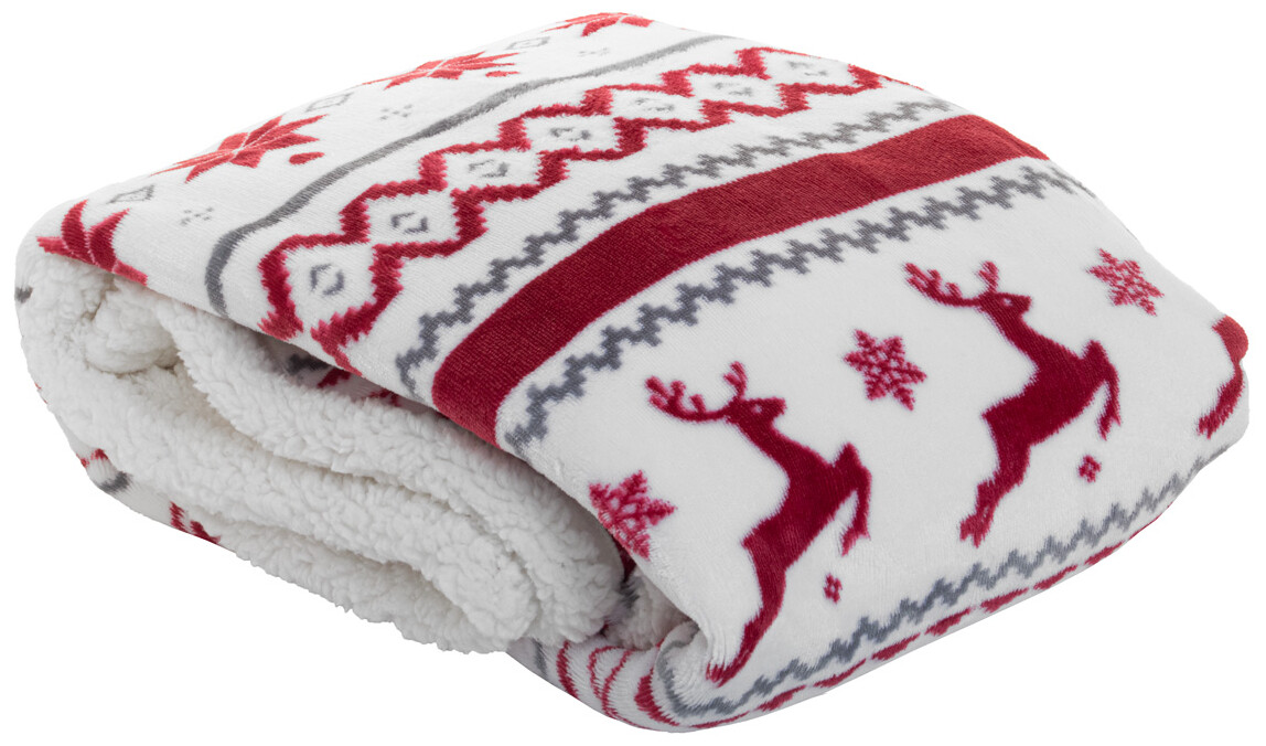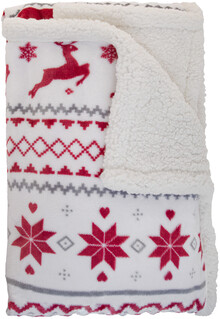 Dvouvrstvá vánoční deka ze 230 g/m2 flanelového fleecu RPET a oboustrannou podšívkou z RPET sherpa fleecu 210 g/m2. Zabalené do stuhy a potisknutelné papírové karty.