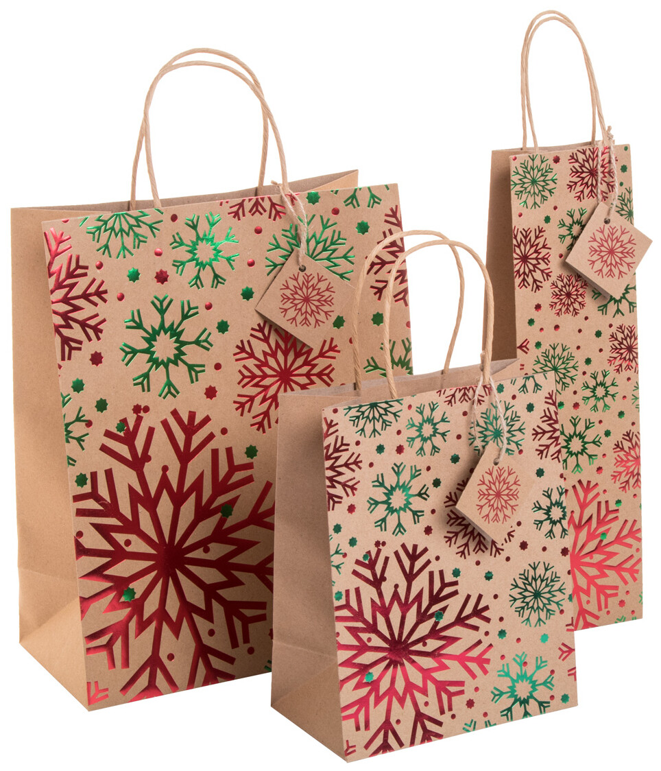 Dárková taška z recyklovaného kraftového papíru s vánočním designem vyraženým fólií, kroucenými uchy a dárkovou visačkou. 140 g/m2.