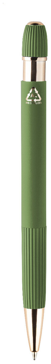 Kuličkové pero z recyklovaného hliníku s pogumovaným tělem a detaily v růžovo-zlaté barvě. Se speciálním povlakem pro zrcadlové laserové gravírování v růžovo-zlaté barvě. S modrou náplní.