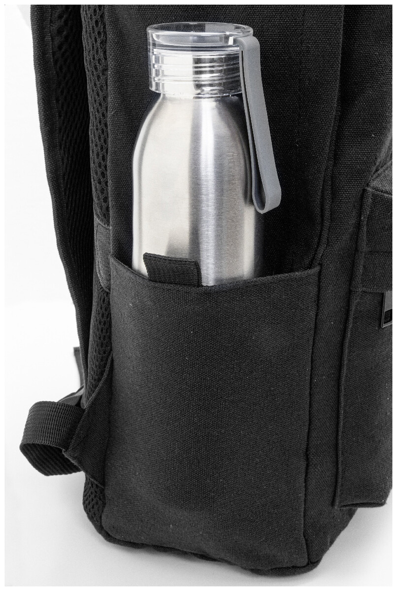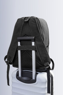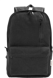 Recyklovaný plátěný batoh s hlavní přihrádkou na zip, polstrovanou přihrádkou na notebook (15"), 2 předními kapsami na zip, bočními kapsami, popruhem na kolečkách, polstrovanými zády a ramenními popruhy. 70% recyklované bavlny a 30% RPET polyesteru. S výrazným štítkem recyklované bavlny.