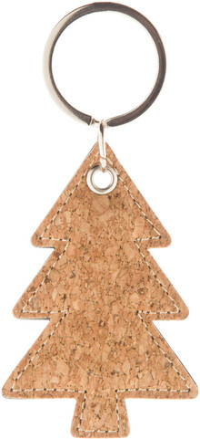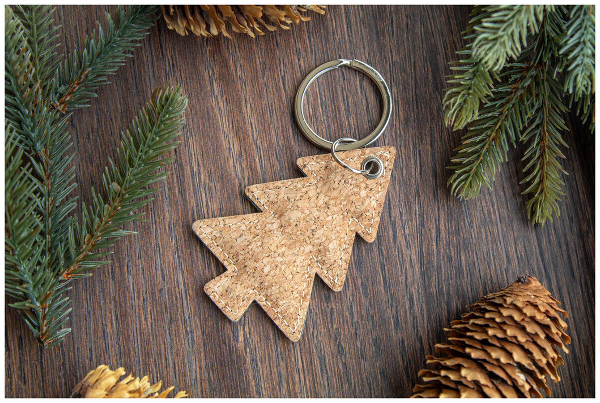 Přívěsek na klíče z přírodního korku a PU kůže ve tvaru vánočního stromku s kovovým kroužkem.
