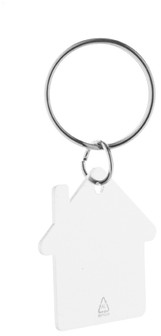 Přívěšek na klíče ve tvaru domečku z recyklovaného hliníku s kovovým kroužkem.