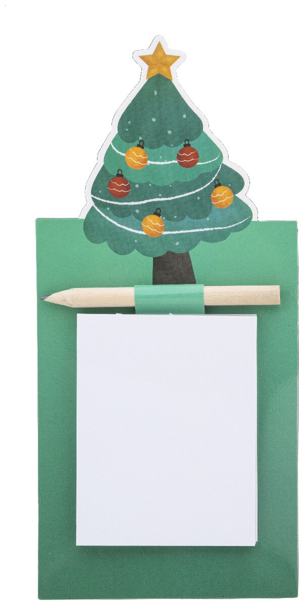 Magnet na ledničku s vánočním designem, poznámkovým blokem na 40 listů a mini dřevěnou tužkou.