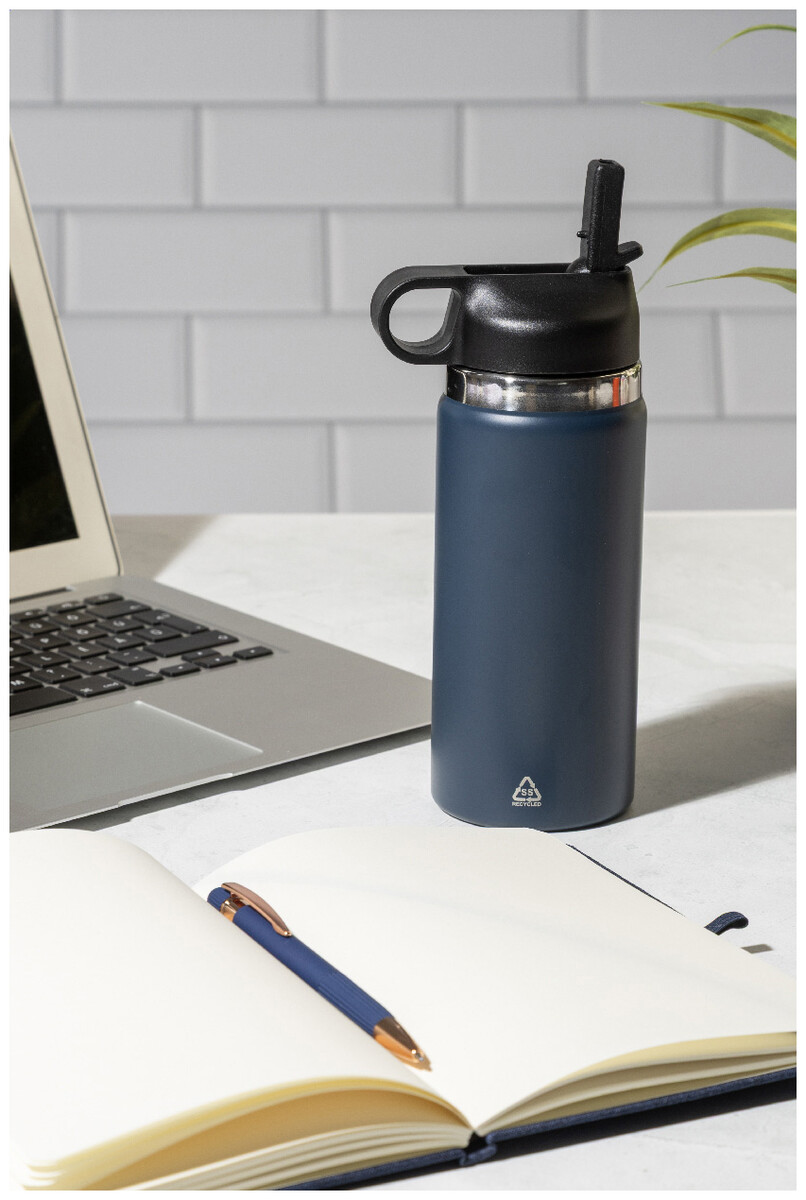 Dvoustěnná vakuová láhev z recyklované nerezové oceli s odklápěcím víčkem z PP, rukojetí a integrovaným brčkem. 500 ml.