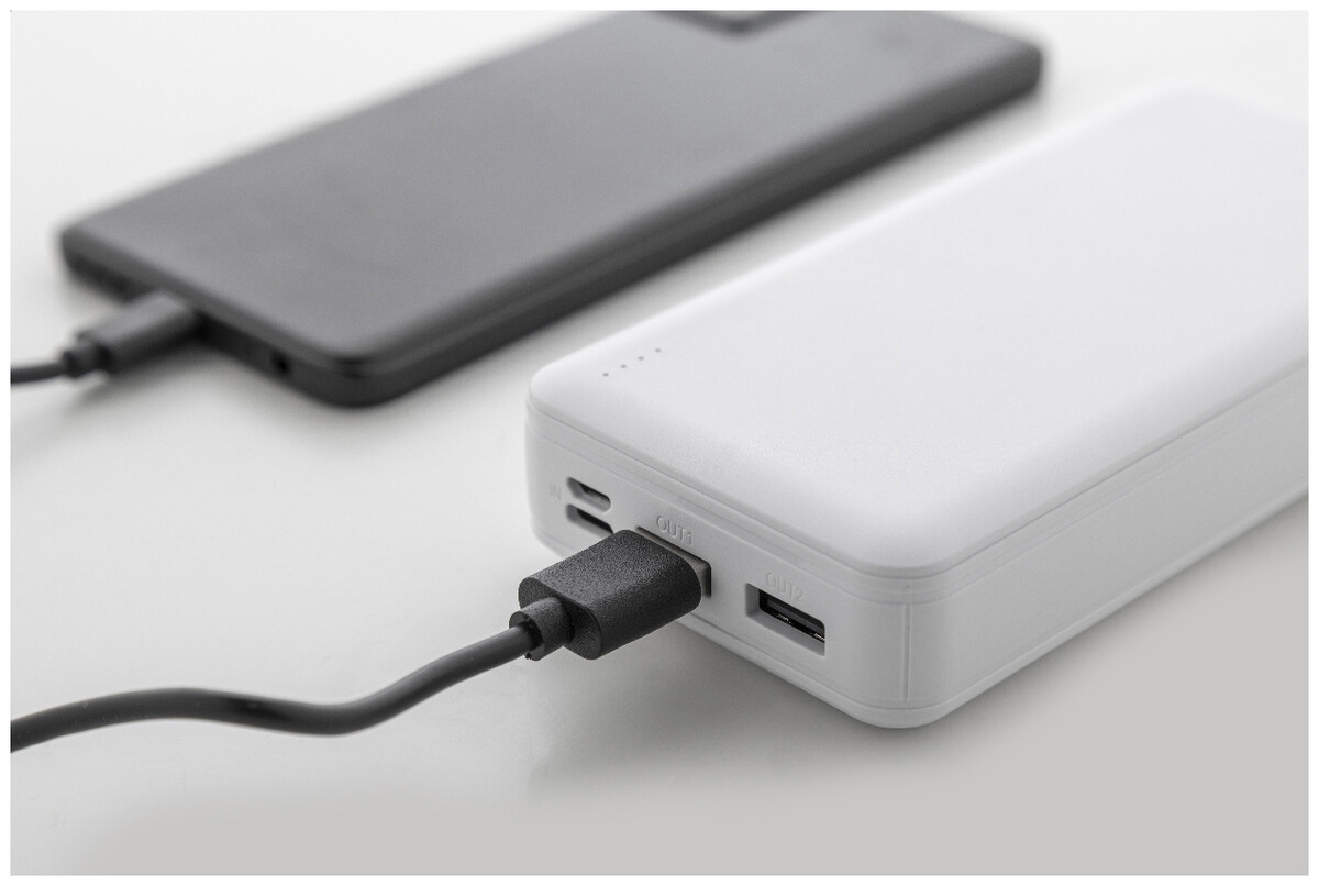 Power banka z recyklovaného ABS plastu s baterií 20 000 mAh. Se 2 USB a 1 nabíjecím portem USB-C. Vstupní porty micro USB a USB-C. Včetně nabíjecího kabelu USB.