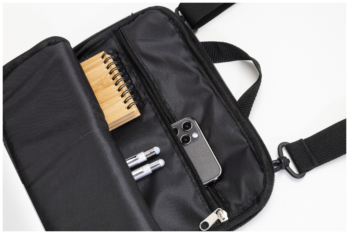 Polstrovaná taška přes rameno z polyesteru 600D RPET na dokumenty nebo notebook s přihrádkou na zip a přední kapsou na zip. Vhodná pro notebooky do velikosti 15". S nastavitelným ramenním popruhem vybaveným vertikální a horizontální polohou. S výrazným štítkem RPET.