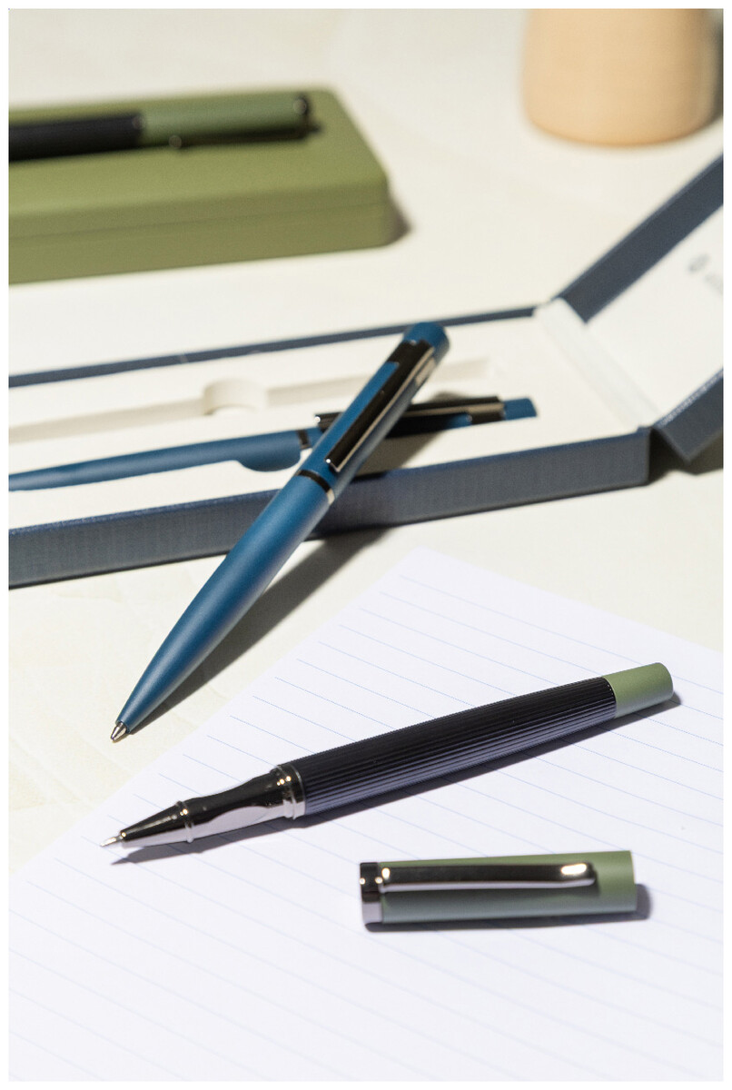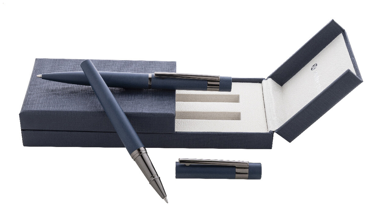 Elegantní sada kovového kuličkového pera a rolleru s lesklými detaily v barvě antracit. V barevně sladěné dárkové krabičce a s modrou náplní. Produkt značky André Philippe.