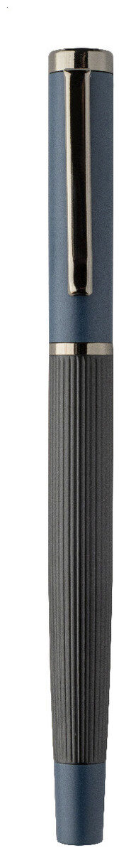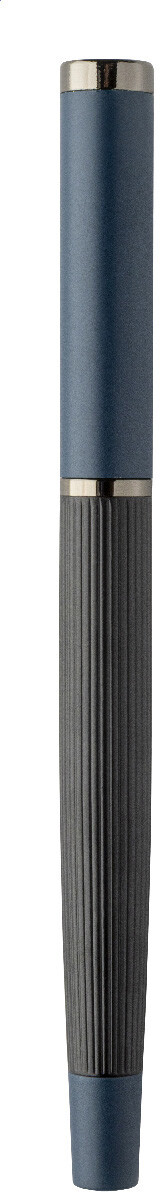 Elegantní sada kovového kuličkového pera a rolleru s pruhovaným tělem, barevnými akcenty a lesklými detaily v barvě antracit. V barevně sladěné dárkové krabičce a s modrou náplní. Produkt značky André Philippe.