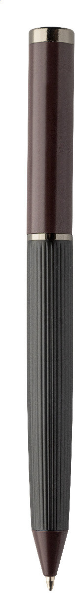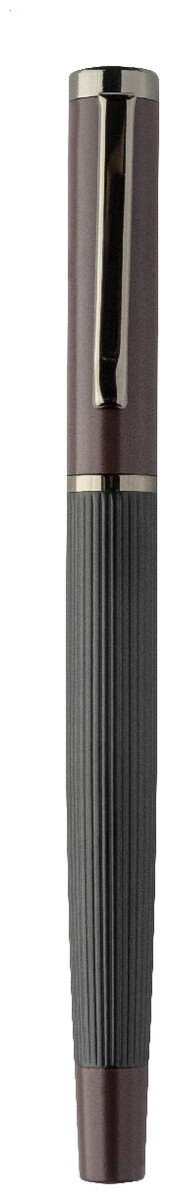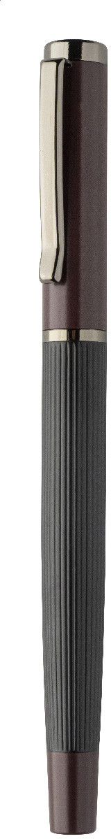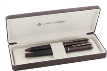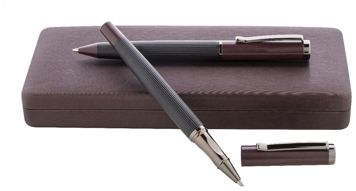 Elegantní sada kovového kuličkového pera a rolleru s pruhovaným tělem, barevnými akcenty a lesklými detaily v barvě antracit. V barevně sladěné dárkové krabičce a s modrou náplní. Produkt značky André Philippe.