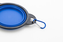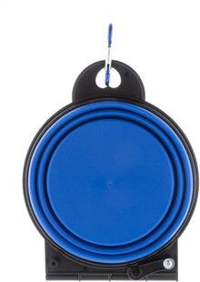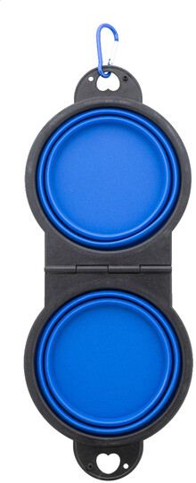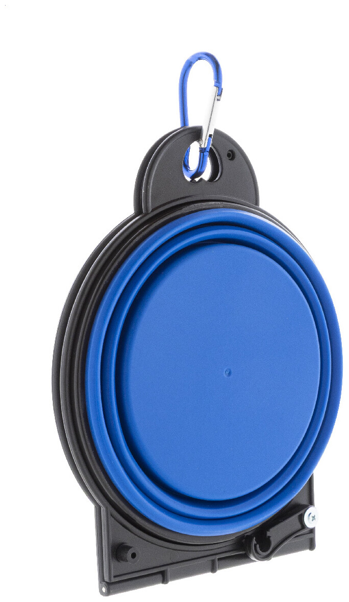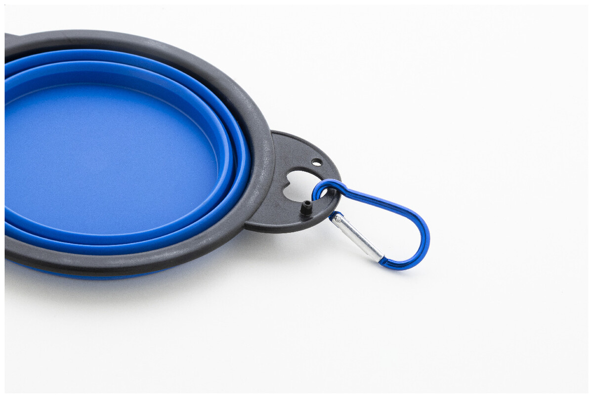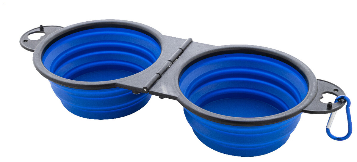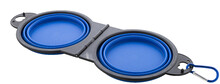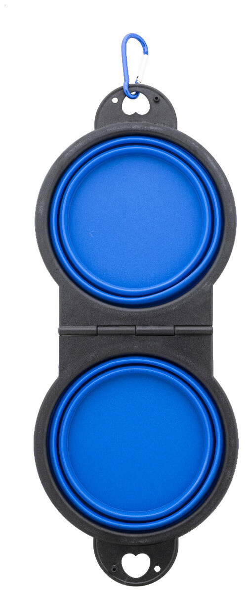 Skládací miska pro domácí mazlíčky z odolného TPE se dvěma přihrádkami o objemu 450 ml a barevně sladěnou hliníkovou karabinou.