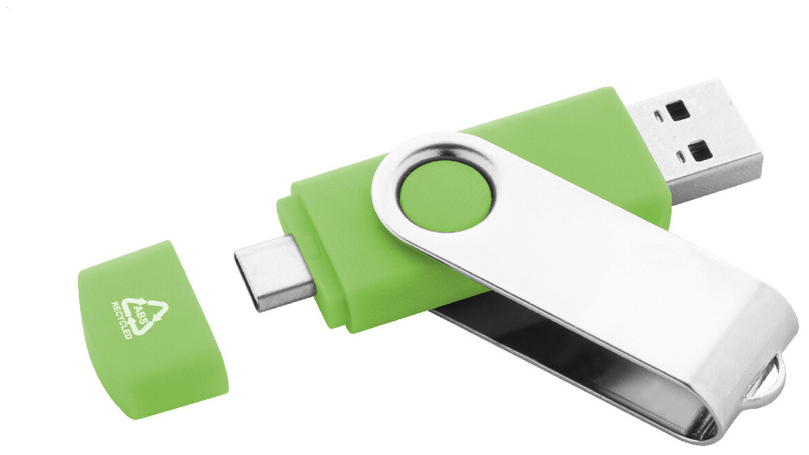 Otočný USB flash disk OTG v pouzdře z recyklovaného ABS a kovu s pamětí 8/16/32 GB. S připojeními USB a USB-C. USB 2.0.
