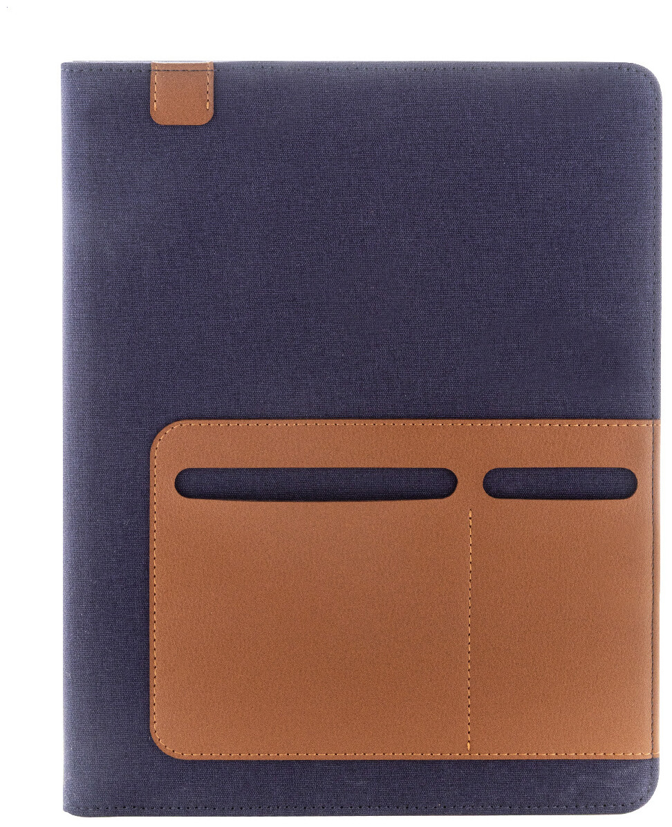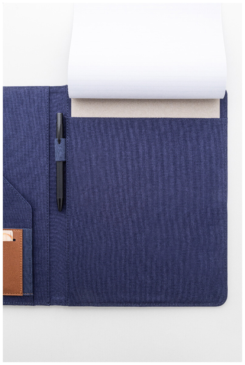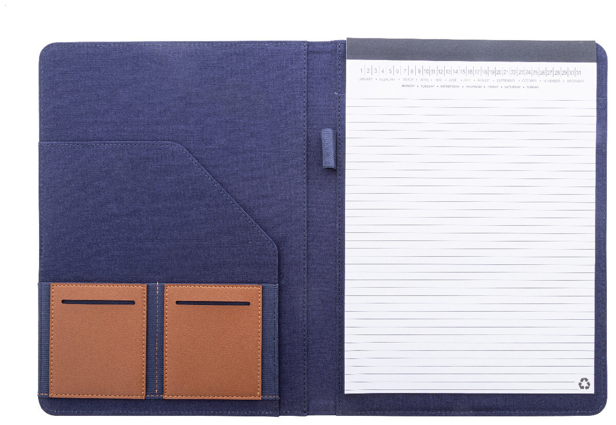 Složka na dokumenty A4 z recyklovaného plátna a recyklované umělé kůže s několika předními a vnitřními kapsami. S blokem na 20 linkovaných listů z recyklovaného papíru. 70 % recyklované bavlny a 30 % RPET polyesteru.