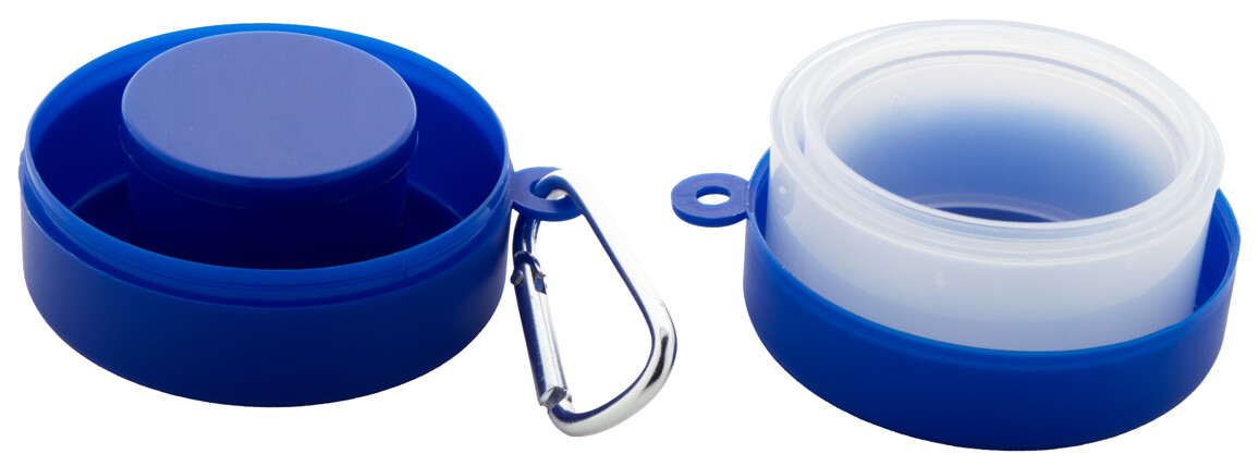 Skládací kelímek z recyklovaného PP plastu s přihrádkou na pilulky a kovovou karabinou. 220 ml. Bez BPA.