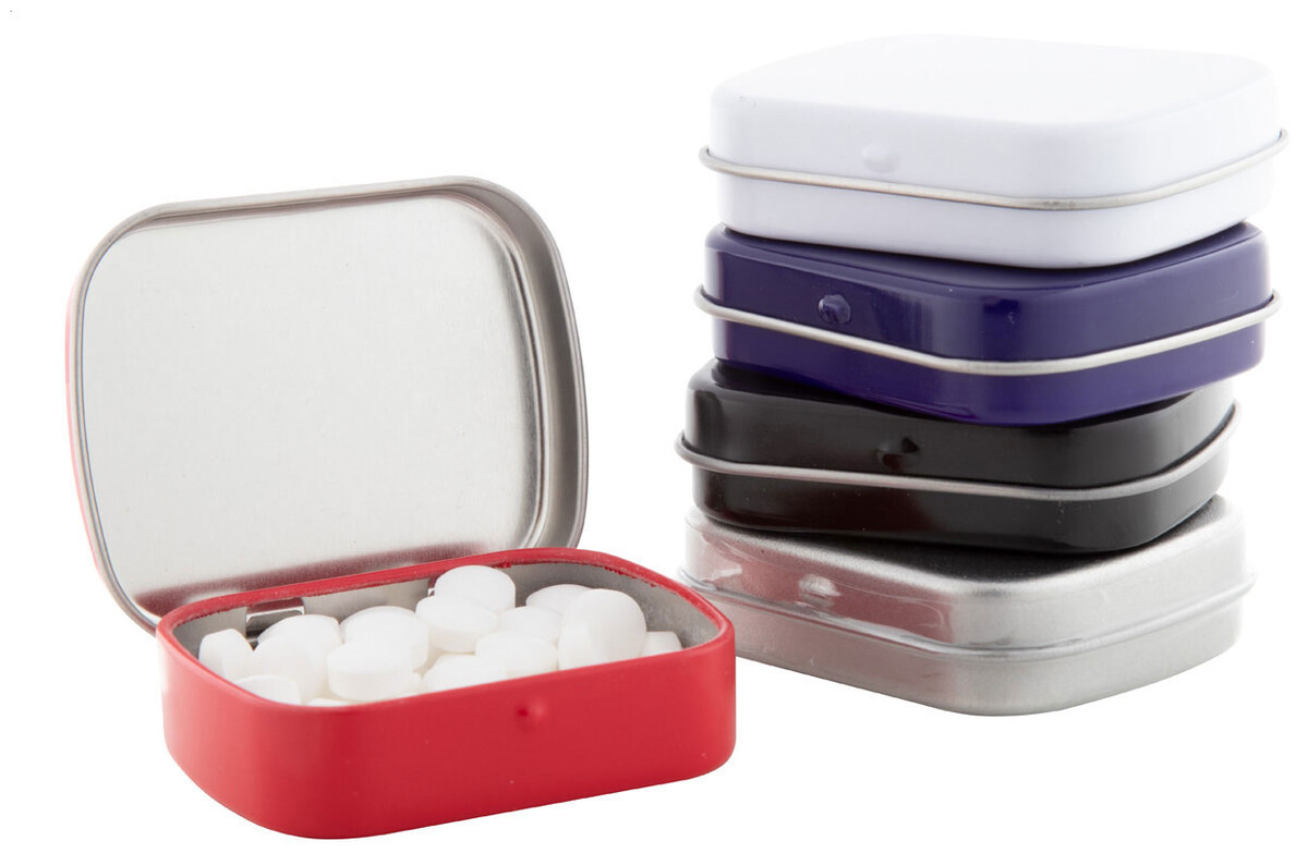Obdélníková kovová krabička s cca. 25 gramů mmentolových bonbónů.