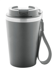 Dvoustěnný termo hrnek z recyklované nerezové oceli s vnějším PP plastem a víčkem na pití. S popruhem na přenášení RPET. 350 ml.
