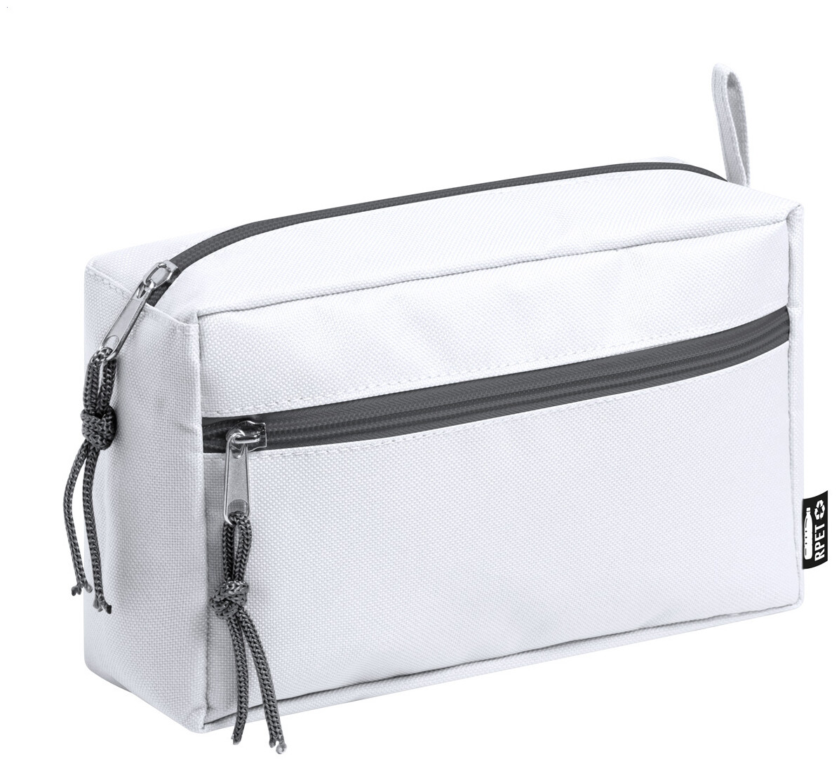 Kosmetická taštička z 600D RPET polyesteru se 2 přihrádkami na zip, s etiketou s označením RPET.