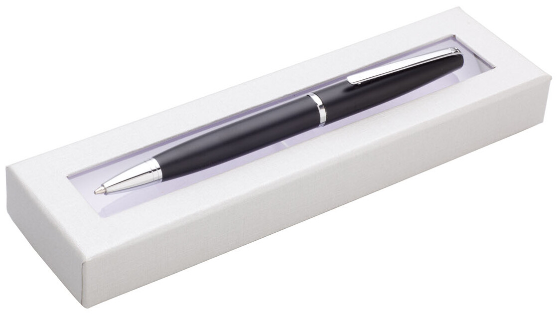 kovová propiska v dárkové krabičce s průhledným okénkem.