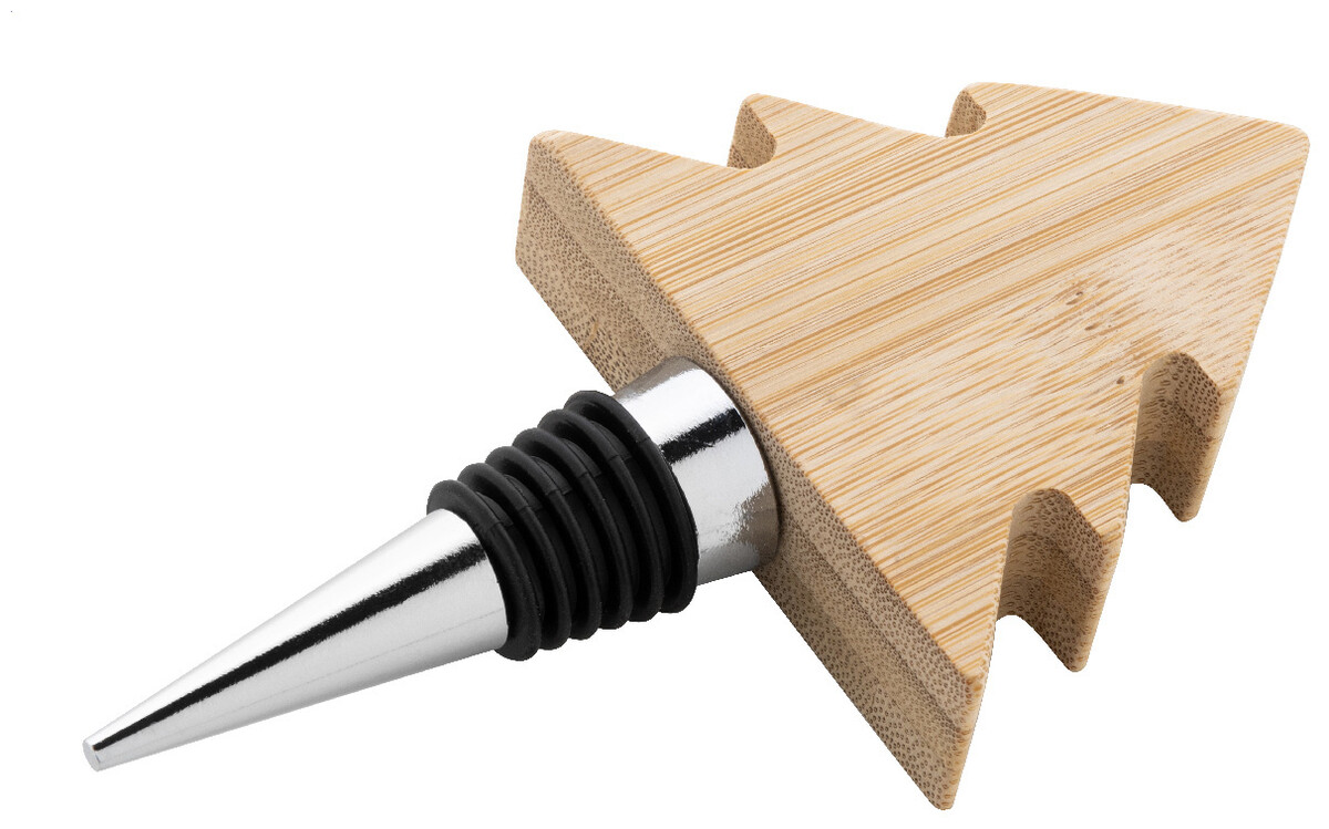 Kovová zátka na víno s bambusovou ozdobou ve tvaru vánočního stromečku.