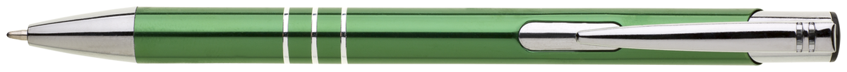 TRIALI hliníková reklamní tužka. Lesklé zelené tělo se třemi stříbrnými proužky a chromovými doplňky.