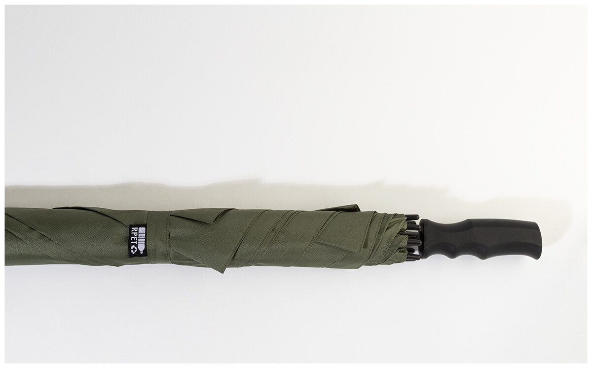 Velký automatický větruodolný čtvercový deštník s celolaminátovou tyčí a rámem, pogumovanou ABS rukojetí. 190T RPET pongee. S charakteristickým RPET štítkem.