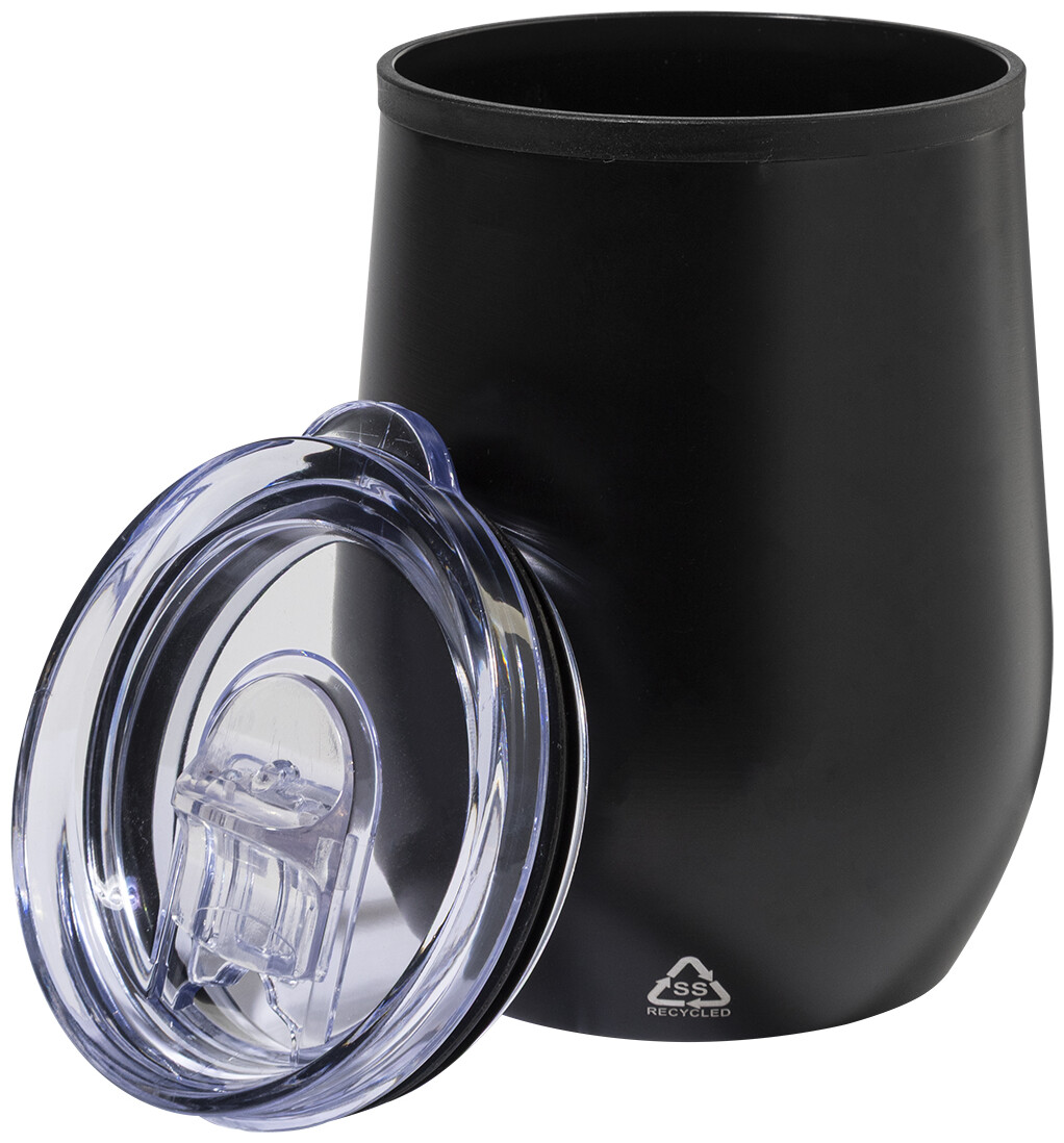 Dvoustěnný termo hrnek z recyklované nerezové oceli s vnitřní stranou z PP a víčkem z PS. 350 ml.